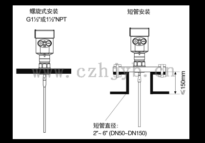 導(dǎo)波雷達(dá)物位計(jì)可采用螺紋連接,螺紋的長(zhǎng)度不要超過(guò)15mm,還可以采用在短管上安裝。安裝短管直徑在2″至6″則安裝短管高度應(yīng)≤100mm(螺紋及短管的長(zhǎng)度越短,測(cè)量越穩(wěn)定),若安裝短管較長(zhǎng),理想狀態(tài)應(yīng)將短管割短,或底部固定纜式探頭及選用絕緣對(duì)中支架以避免纜式探頭與短管末端接觸。