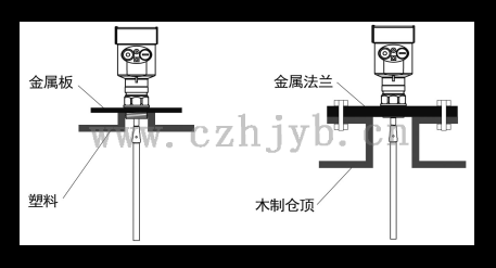無(wú)論是纜式或桿式,若想導(dǎo)波雷達(dá)工作正常,過(guò)程連接表面應(yīng)為金屬。當(dāng)導(dǎo)波雷達(dá)裝在塑料罐上時(shí),若罐頂也是塑料或其它非導(dǎo)電材質(zhì)時(shí),儀表需要配金屬法蘭,若采用螺紋連接,需配一塊金屬板。