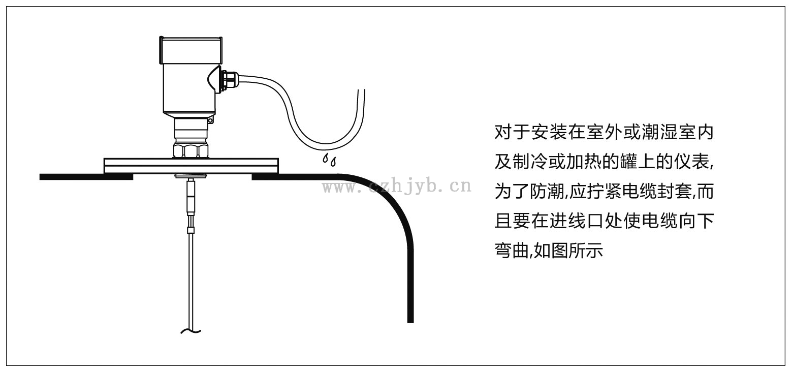 在進(jìn)入電氣接口前,將電纜向下彎曲,以確保水不會(huì)流入殼體,見(jiàn)①