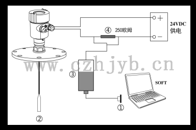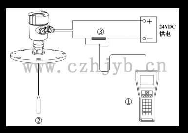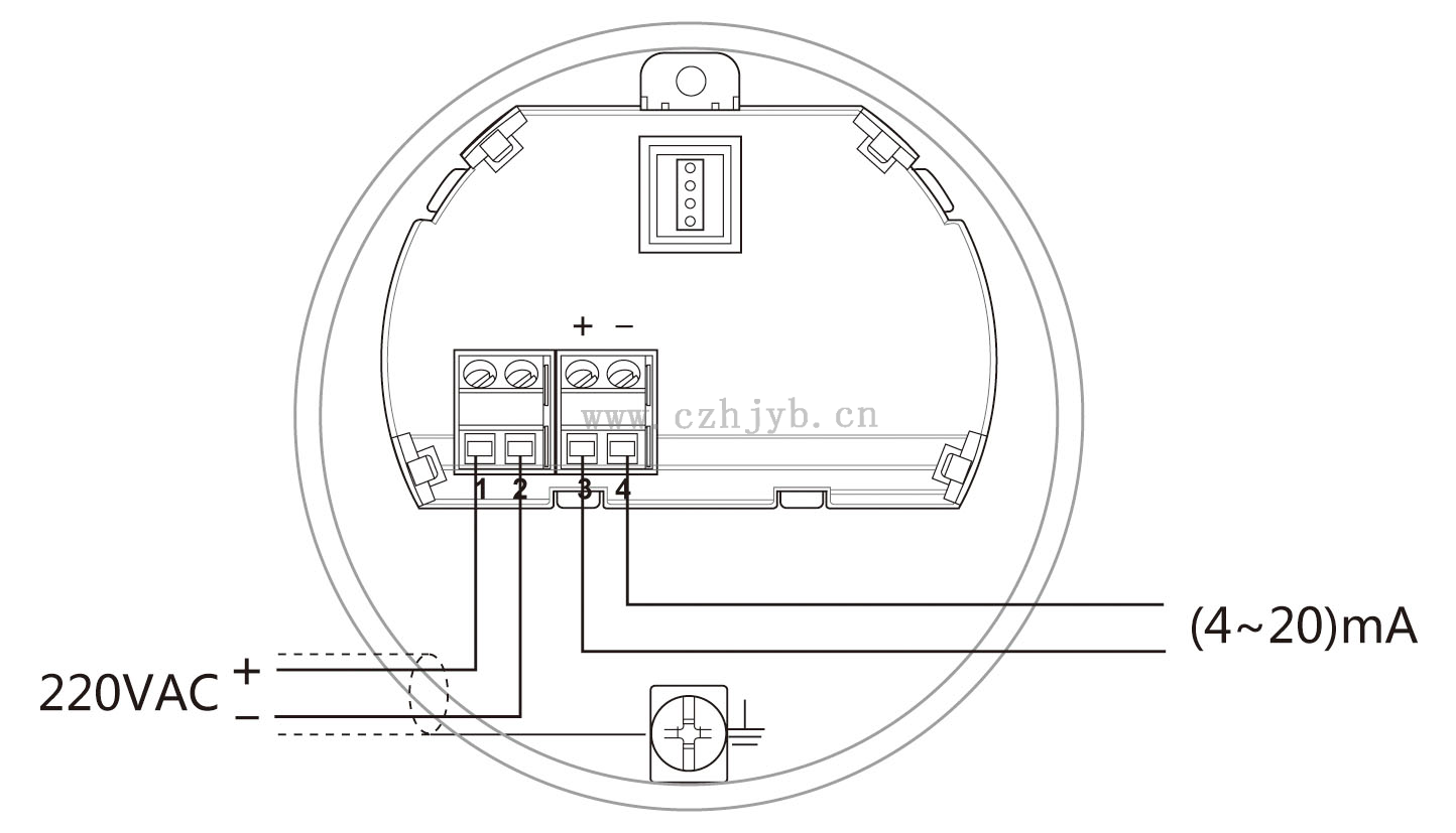 (4~20) mA/HART(兩線制) 供電電源和輸出電流信號(hào)共用一根兩芯屏蔽電纜線。具體供電電壓范圍參見(jiàn)技術(shù)數(shù)據(jù)。對(duì)于本安型須在供電電源與儀表之間加一個(gè)安全柵。