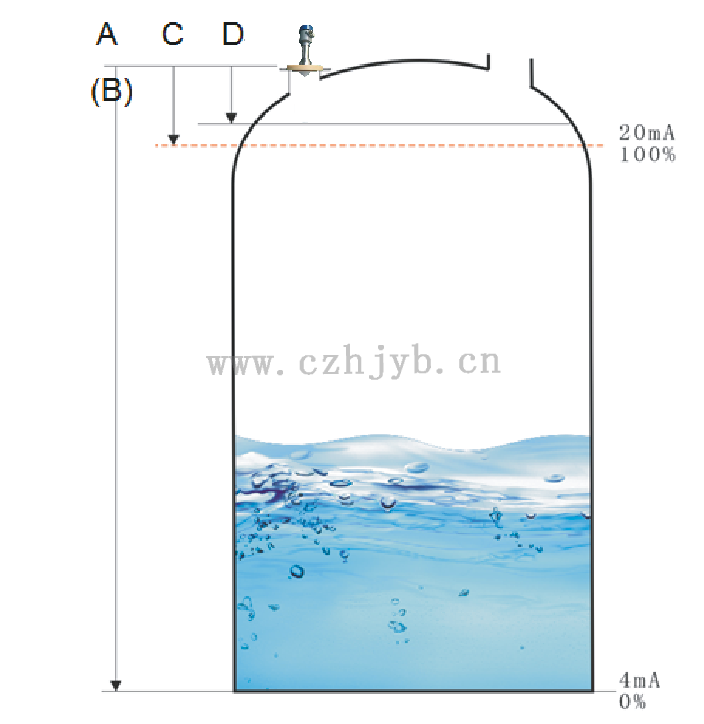注:使用雷達(dá)物位計(jì)時(shí),務(wù)必保證最高料位不能進(jìn)入測(cè)量盲區(qū)(圖中D所示區(qū)域)。
