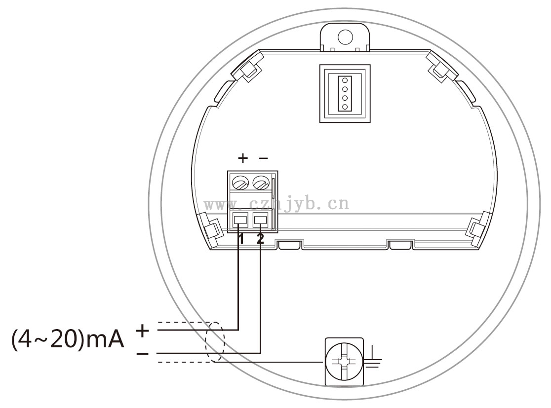 (4~20) mA/HART(兩線制) 供電電源和輸出電流信號(hào)共用一根兩芯屏蔽電纜線。具體供電電壓范圍參見技術(shù)數(shù)據(jù)。對(duì)于本安型須在供電電源與儀表之間加一個(gè)安全柵。